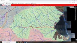 Esta es la cuenca del Mar Menor, una gran superficie de tierras super fértiles, que se están explotando casi en su totalidad de forma intensiva, que es posiblemente la forma más contaminante, la línea roja es la Rambla del Albujón, la otra roja pequeña es la Rambla de Miranda y el resto de líneas azules, son ramblizos y ramales