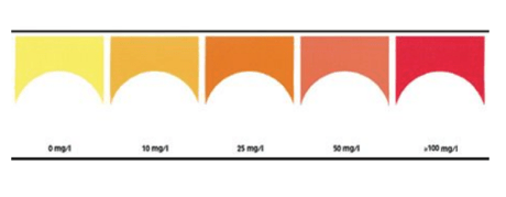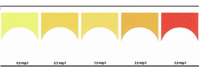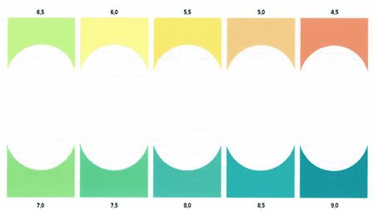 5. pH: en la probeta de 20 ml, se coge una muestra de agua de 5ml, haciendo un lavado previo de la probeta con la muestra, se añaden 4 gotas del reactivo, se agita. Al instante la muestra se tiñe de un color y se compara con el pH-Test. Tiene 10 valores diferentes de pH: 4,5 hasta 9 con intervalo de 0,5.