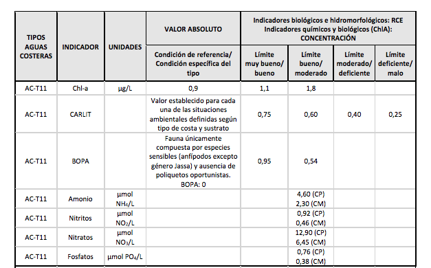 En la siguiente tabla se indican los parámetros de las concentraciones de nutrientes que superan el límite permitido, desde el 16 de octubre de 2019 hasta el 25 de noviembre de 2020.