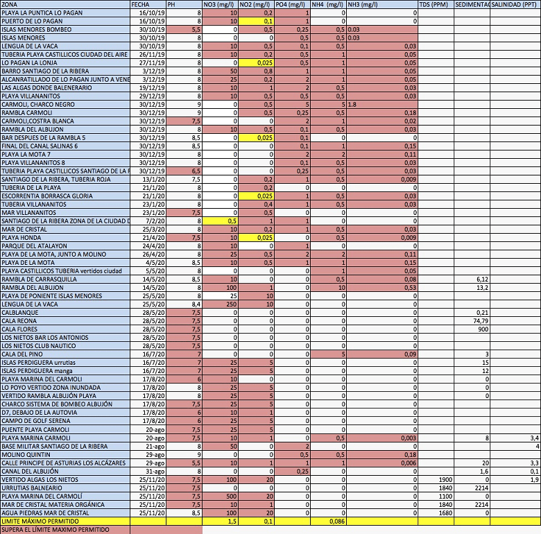 ESTOS SON LOS RESULTADOS DE LOS ANÁLISIS DE AGUAS DEL MAR MENOR QUE LLEVAMOS HACIENDO DESDE HACE MÁS DE UN AÑO.