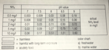 6. Amonio y amoniaco: es el mismo procedimiento que el anterior, la única diferencia es que son dos reactivos, de los cuales hay que añadir 6 gotas del reactivo 1, agitar hasta que el liquido se disuelva y a continuación, añadir otras 6 gotas del reactivo 2. Transcurridos 5 minutos se compara la tonalidad que a adquirido la muestra. A partir del valor que se obtiene de NH4 y el pH, con una tabla que indica el amoniaco libre y toxico. Los valores obtenidos son de (0-0,5-1-2-5) mg/l.
