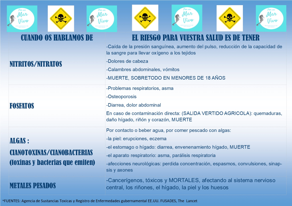 A parte, las cantidades de nitratos,nitritos, fosfatos, amonio en el agua y la cantidad de algas permiten la proliferación de cianobacterias (bacterias que parecen algas). En el mar menor se ha podido constatar verdaderas colonias de estas cianobacterias. Ciertas de ellas son peligrosas para la salud humana y ningún estudio se está haciendo de ellas, cuando las autoridades tienen obligación de velar por nuestra salud.