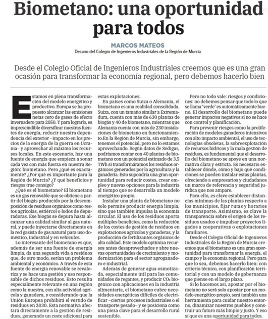 En relación con el artículo de opinión publicado en el periódico La Verdad el pasado 3 de septiembre, firmado por el decano del Colegio Oficial de Ingenieros Industriales de la Región de Murcia, Marcos Mateos, desde la Coordinadora de Plataformas Stop Biogás de la Región de Murcia queremos realizar algunas puntualizaciones: