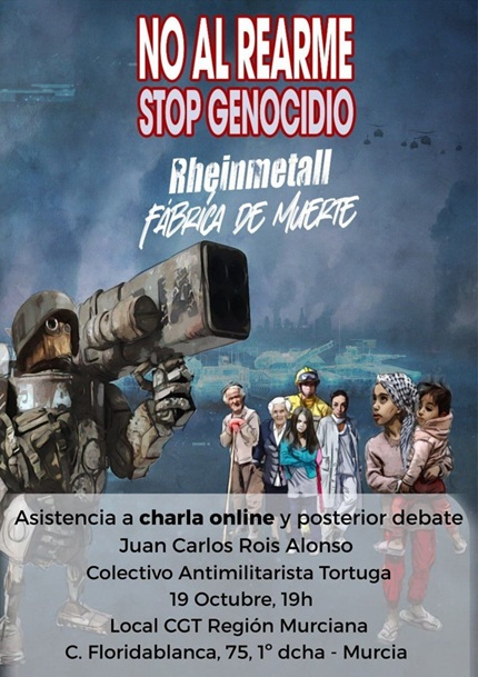 En las actividades contra el Rearme y la Deshumanización, el próximo Domingo 19 de Octubre a las 19h, en CGT C/Floridablanca, 75, tendrá lugar la Charla-debate “NO al REARME” por Juan Carlos Ríos Alonso, abogado y activista, veterano miembro del Colectivo Antimilitarista Tortuga. Este evento será transmitido simultáneamente en varios territorios: Extremadura, Castilla León, Madrid, Asturies, además de en Murcia.