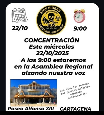 La Plataforma Stop Biogás- Los Camachos-Cartagena-Mar Menor convoca el miércoles día 22 a las 9:00 horas en el Paseo Alfonso XIII 54 frente de la Asamblea Regional a una concentración contra la “Ley de Simplificación Administrativa”.