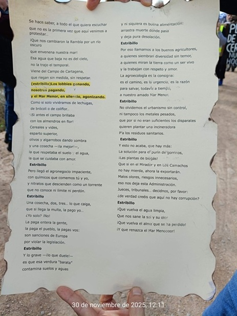 “Las asociaciones y colectivos convocantes agradecemos a todas vuestra presencia y apoyo. Cada año volvemos a manifestarnos aquí, porque la Rambla del Albujón sigue siendo un torrente permanente de aguas contaminadas por la agroindustria de la cuenca vertiente del Mar Menor.