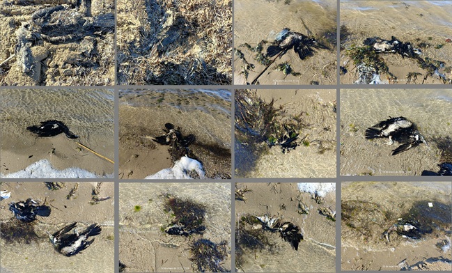 Ayer, en la orilla del Mar Menor frente a la Calle Sotavento, aparecieron trece cormoranes muertos.