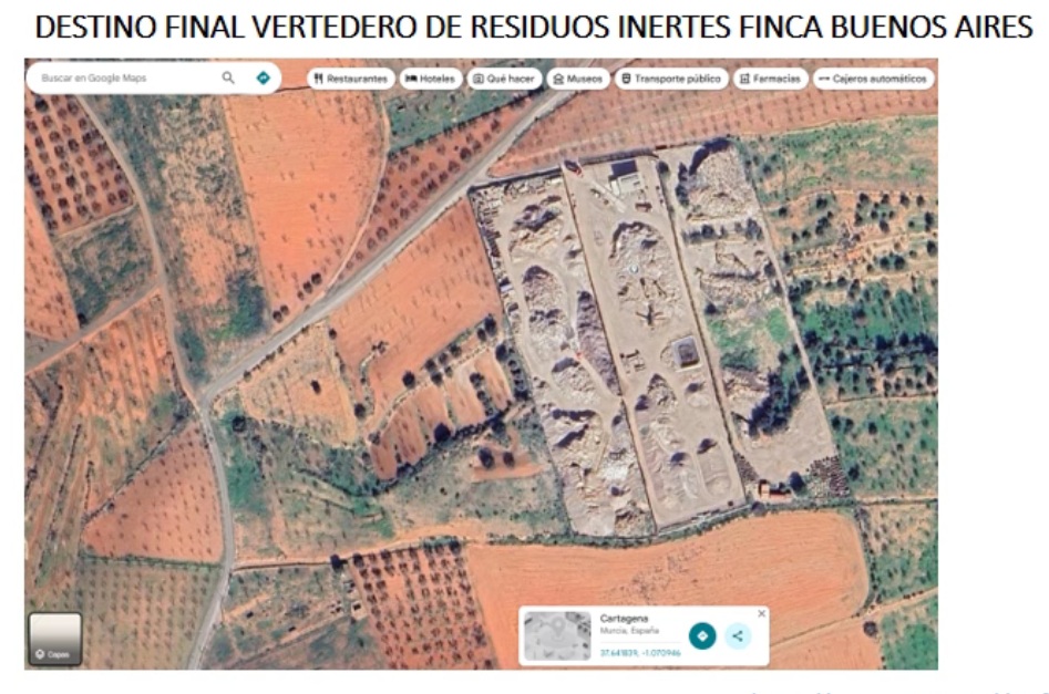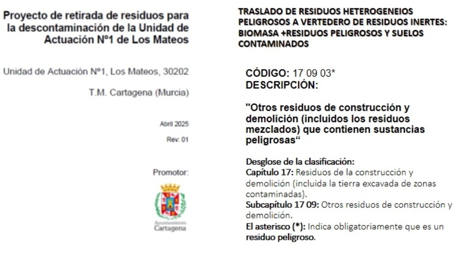 Como no podía ser de otra manera, los restos vegetales, mezclados con residuos peligrosos y suelos contaminados, acaban en un vertedero de residuos inertes (escombros), tratándose de Otros residuos de construcción y demolición (incluidos los residuos mezclados) que contienen sustancias peligrosas.