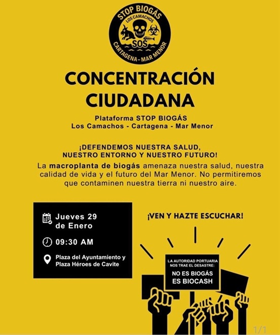 La Plataforma Ciudadana Stop Biogás Los Camachos-Cartagena-Mar Menor convoca a la ciudadanía a una concentración pública el jueves 29 de enero, a las 9:30 horas, en la Plaza del Ayuntamiento y Plaza Héroes de Cavite, para exigir la suspensión total, definitiva y jurídicamente vinculante del proyecto de macroplanta de biogás previsto en el polígono industrial de Los Camachos, así como transparencia y garantías legales en la gestión del suelo público.