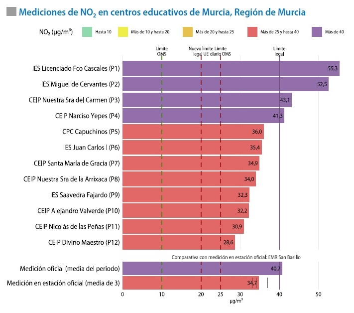 · El 100% de los centros educativos analizados presentaron niveles muy por encima del valor límite anual recomendado por la OMS para el contaminante NO2, de 10 μg/m3. Esto demuestra que la situación es preocupante, desde el punto de vista de la salud pública.
