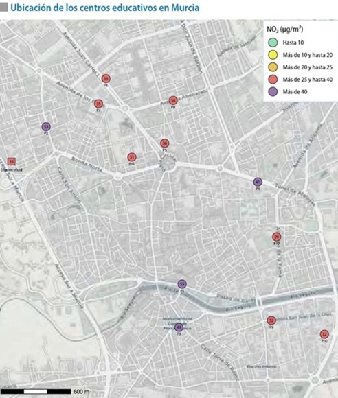 En el caso del Municipio de Murcia, partiendo de la experiencia anterior, se seleccionaron doce centros educativos en el casco urbano de la ciudad, estando la mayoría ubicados junto a vías de alta o muy alta intensidad de tráfico, ya que el NO2 es uno de los contaminantes más asociados al tráfico, aunque se seleccionaron varios centros situados en vías de menor intensidad, para observer el contraste de los niveles de contaminación (ver tabla y gráficos al final)